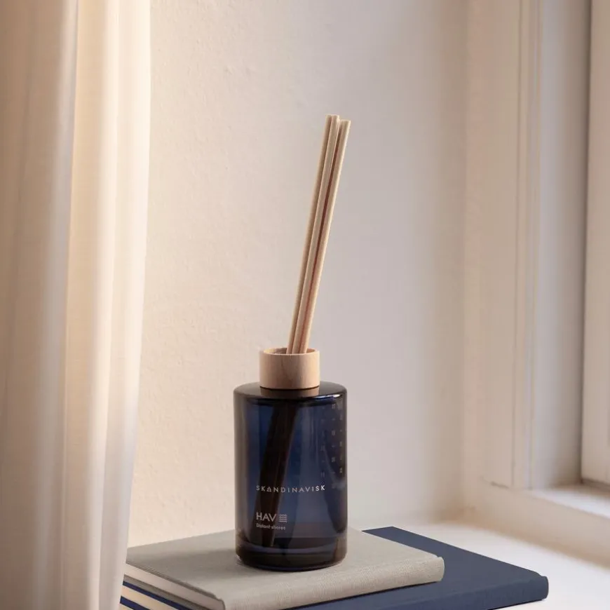 Skandinavisk HAV Scent Diffuser kombinerer skandinaviske duftfortellinger med vegetabilske oljer fra fornybare kilder, fylt i en malt glassvase. Den har en dekorativ FSC-sertifisert bøketre-ring og åtte høyytelsespinner som gir en skånsom og bærekraftig romduft i opptil 3 måneder.