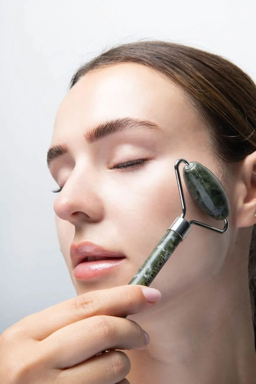 - Jade Roller skal rulles fra midten av ansiktet opp og ut mot sidene.