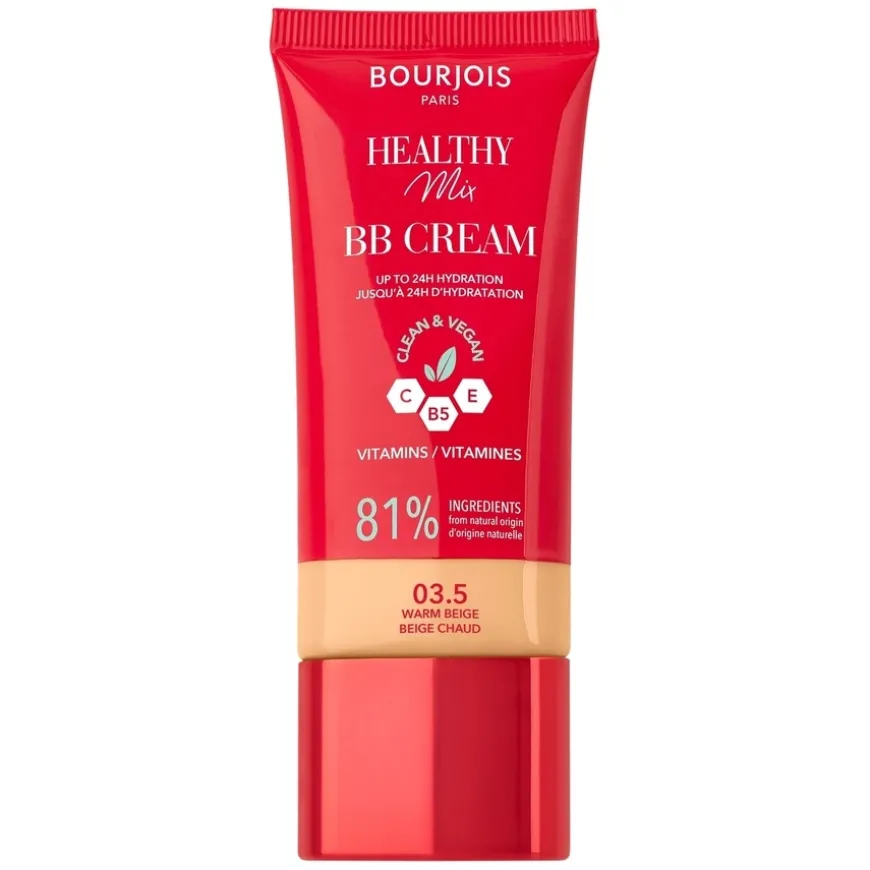 Bourjois Healthy Mix BB Cream forener dekkevnen til en foundation med fuktighetsgivende pleie for en naturlig strålende hud. Formelen jevner ut hudtonen, skjuler porer og reduserer synligheten av urenheter, mørke flekker og rødhet. Den lette og silkemyke teksturen gir en feilfri, men naturlig finish som varer hele dagen. Med 81 % naturlige ingredienser er denne BB-kremen vegansk og skånsom mot huden. Inneholder Schisandra-bær for å berolige huden, grønn linse for å stramme opp porer og absorbere overflødig olje, samt vitaminer C, E og B5 for en beskyttende antioksidanteffekt.