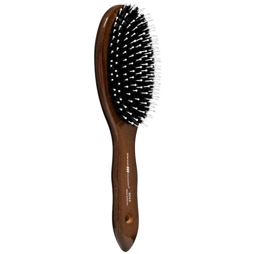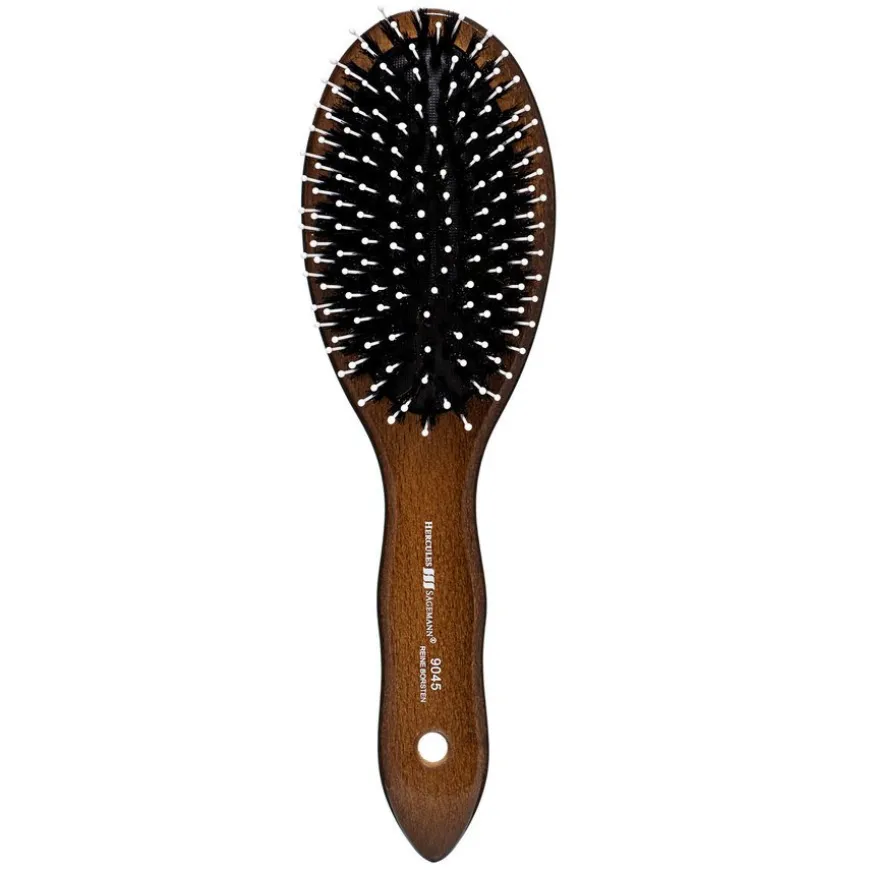 En nydelig hårbørste laget i av valnøtt med en unik varmebestandig bust og polstret børsteplate. Den glir lett gjennom håret og løsner floker og knuter på en skånsom måte – uten å gjøre håret statisk.