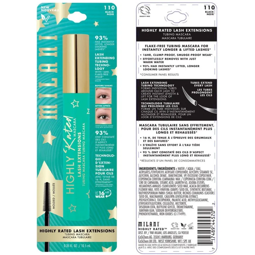 Milani Highly Rated Lash Extensions Tubing Mascara gir dramatisk forlengelse og løft til vippene for den falske vippeeffekten. Denne japansk-inspirerte Lash Extending tubing-teknologien omslutter hver vippe med rørformede polymerer for å tilføre umiddelbar lengde og løft. Den ikke-flassende, ikke-klumpende formelen påføres sømløst, varer opptil 16 timer og fjernes enkelt med varmt vann. Beriket med sheasmør og ricinusfrøolje, hjelper denne kraftige mascaraen også med å nære og pleie vippene mens du bruker den.