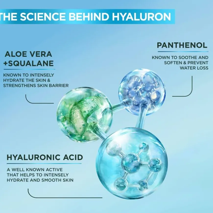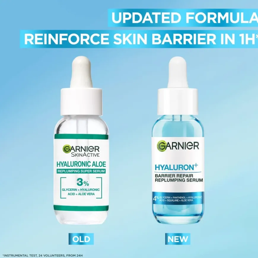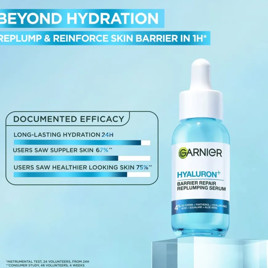 Hyaluron Barrier Repair Replumping Serum er utviklet for rask reparasjon av hudbarrieren, for å gi en fyldigere hud og 24 timers fukt. Formelen utnytter effekten av hyaluronsyre, et kjent aktivt stoff kjent for å gi intens fukt og gjøre huden mykere. Den er kombinert med aloe vera, en ingrediens kjent for å tilføre dyp fuktighet, [glyserin] som låser inn fuktigheten, [panthenol] som virker beroligende og mykgjørende, og squalane, kjent for å styrke hudens barriere. Huden blir umiddelbart fuktet, glattere og mykere**. Etter 1 time er hudbarrieren styrket*. Fra dag 3 begynner hudens barriere å repareres***. Passer for alle hudtyper, også sensitiv hud, og er testet under dermatologisk kontroll.