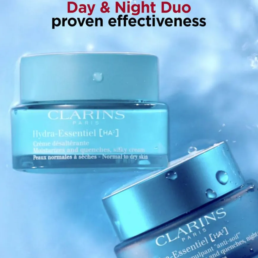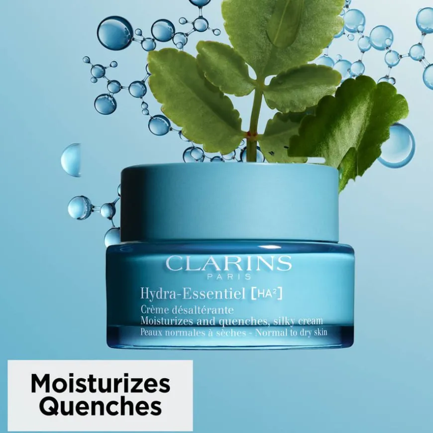 Clarins populære Hydra-Essentiel-kremer relanseres med ny stjerneingrediens: Hyaluronsyre! Hydra Essentiel Cream er en dagkrem som tilfører optimalt med fuktighet gjennom dagen og bekjemper at huden mister fylde på grunn av miljøpåvirkning av forurensing, UV-stråler og vær. For alle hudtyper.