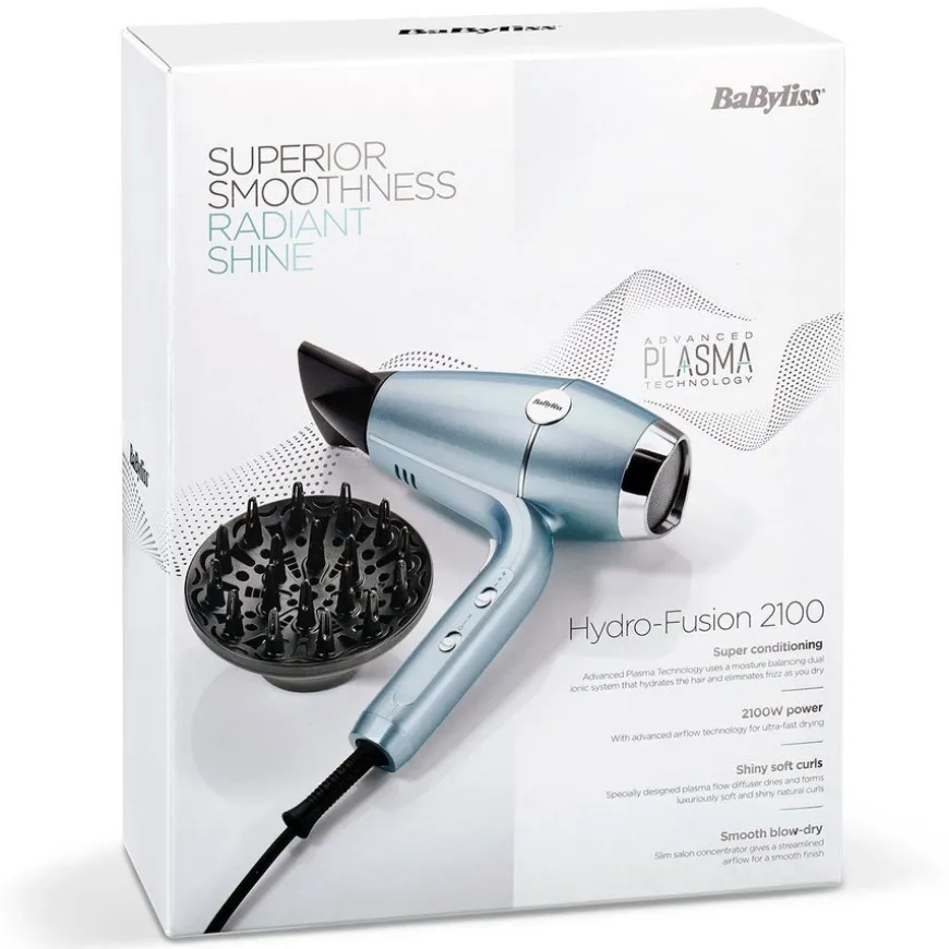 Med hårføneren BaByliss 2100 W Hydro Fusion får du både rask tørking og overlegent utjevnet resultat med strålende glans. Advanced Plasma-teknologien bruker et fuktighetsbalanserende dobbelt ionesystem som kombinerer både positive og negative ioner. De arbeider sammen for å bevare hårets fuktighet og sørger for at det ikke blir krusete mens du tørker det. Håret blir silkemykt og får en vakker glans.