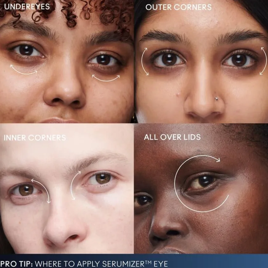 - Fortsett å massere oppover til øyelokket og brynbenet, og deretter tilbake til den indre øyekroken for å sikre 360° påføring rundt hele øyet.