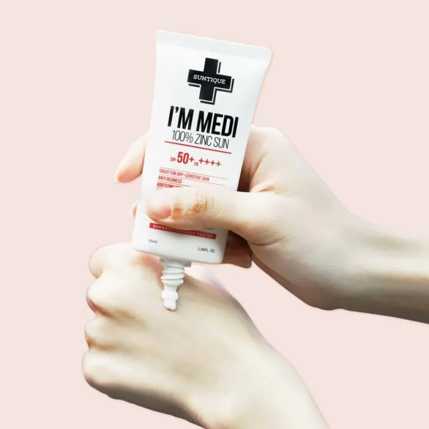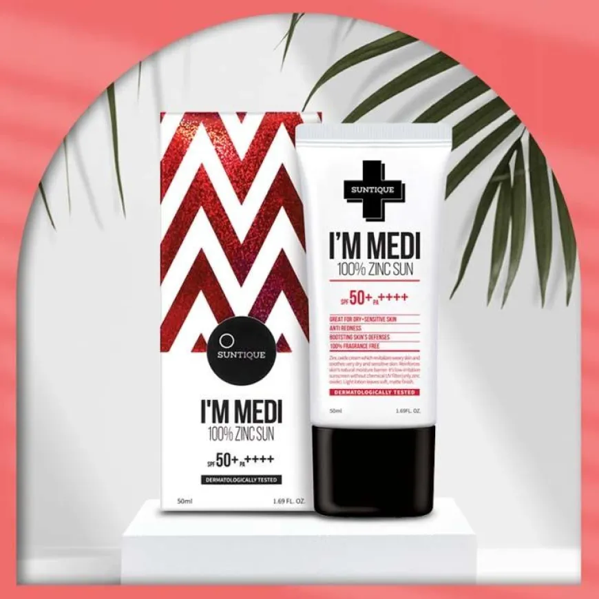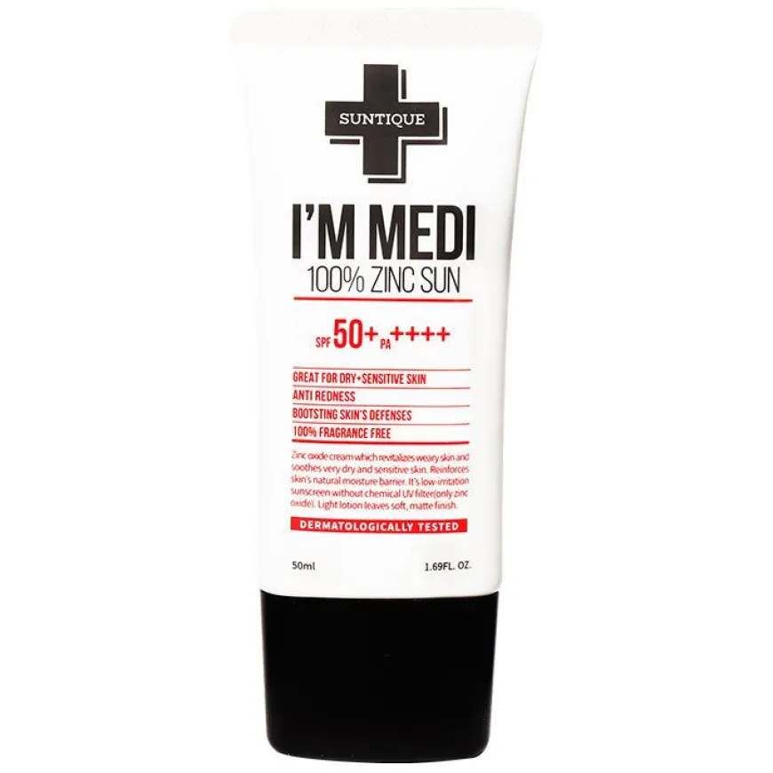 I’m Medi 100% Zinc Sun er en solkrem for deg med tørr, sensitiv og med rødhet i huden. Også tilpasset deg med rosacea, eksem og psoriasis. Dette fantastiske produktet fra Suntique er en utrolig skånsom og hudvennlig solkrem laget for effektivt å blokkere UV- og UVB-stråler samtidig som den tar vare på selv den mest sensitive huden. Hvordan? Filtrene er 100 % fysiske og basert på sinkoksid, som gir utmerket beskyttelse mot UV-stråler samtidig som den beroliger og mykgjør huden. Dette har vist seg å være den beste komponenten for å beskytte den tørreste og mest sensitive huden mot solen! Solkremen inneholder også et trippelt hyaluronsyrekompleks og ekstrakter av gotu kola og lakris for å fukte huden og styrke dens naturlige barriere, men har ingen nanopartikler eller kunstige parfymer som kan irritere huden. Siden formelen er vannbasert, er kremen lett, men svært fuktighetsgivende. Med denne tenker du ikke over om du brukes en solkrem eller en fuktighetskrem. Også tilpasset barn.
