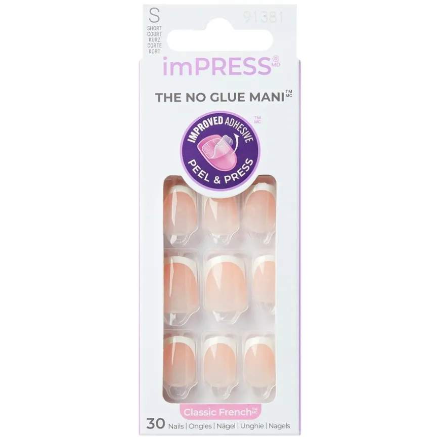 imPRESS Nails Classic French Model fra KISS er relansert med den innovative SuperHold-teknologien som gir bedre hold og naturlig passform. Den patenterte teknologien kombinerer to lag med lim: ett lag fester seg til løsneglen, og det andre sikrer et skånsomt, men sikkert feste til din naturlige negl. Den forbedrede passformen gir en jevn overgang ved neglebåndet, noe som resulterer i et feilfritt og naturlig utseende.
