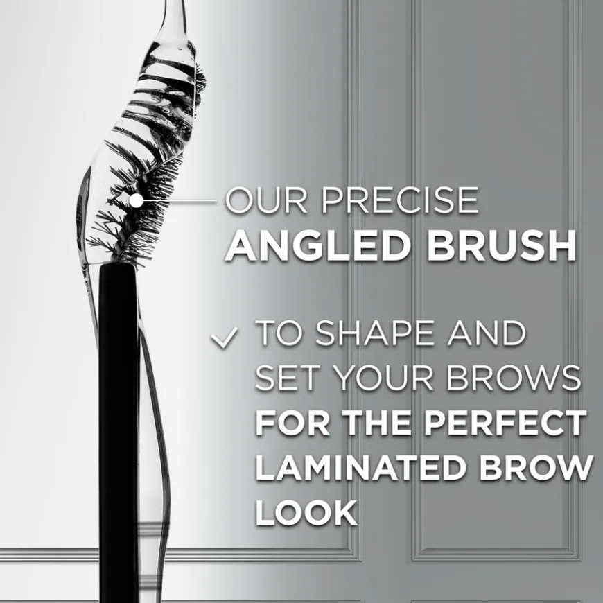 Den unike applikatoren med vinklet børste og asymmetriske børstehår hjelper deg å forme og fiksere brynene for en perfekt laminert brynslook.