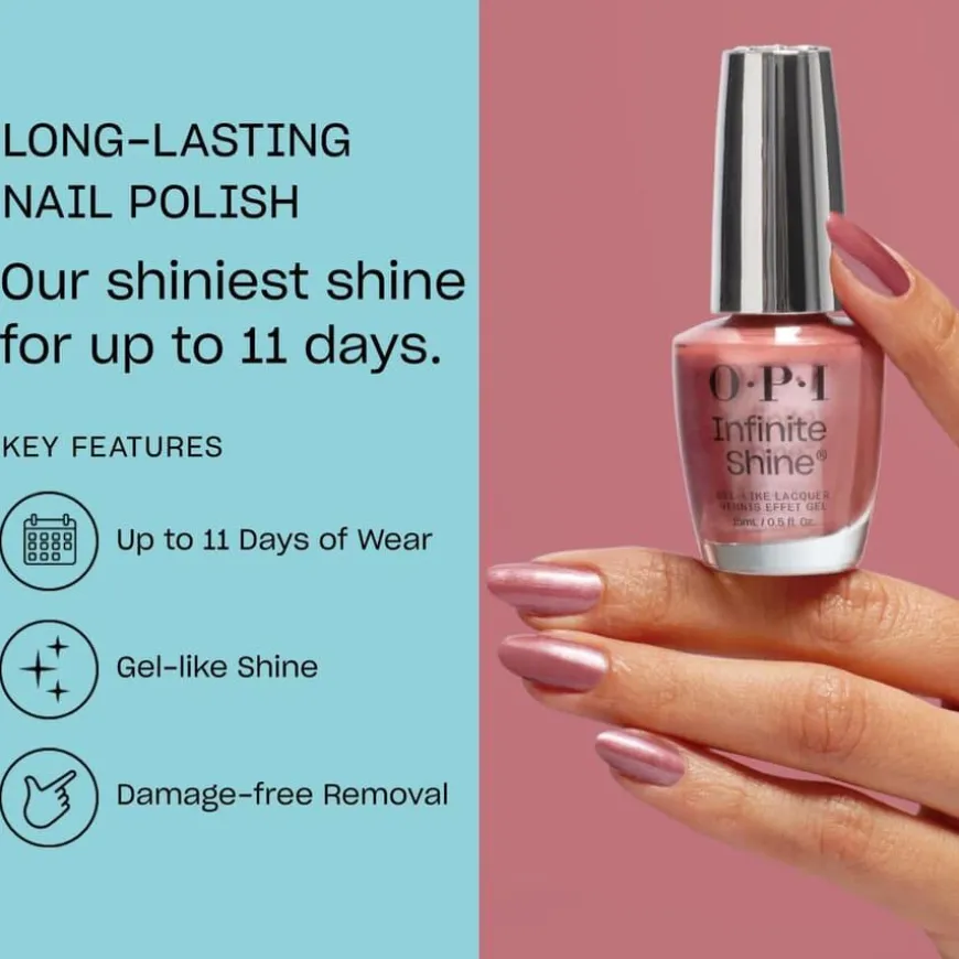 Locks like gel, unlocks like lacquer. OPI introduserer Infinite Shines nye banebrytende formel med en forhåndsherdet gelteknologi som gir glans, dekning og langvarig holdbarhet i opptil 11 dager. Den gellignende formelen omslutter neglene for en glatt og jevn dekning uten striper eller bobler, og fjernes enkelt med aceton for rask og skadefri fjerning. Den er så bra at man tror at det er gel. Infinite Shine er alt du elsker med gel og alt du elsker med lakk.