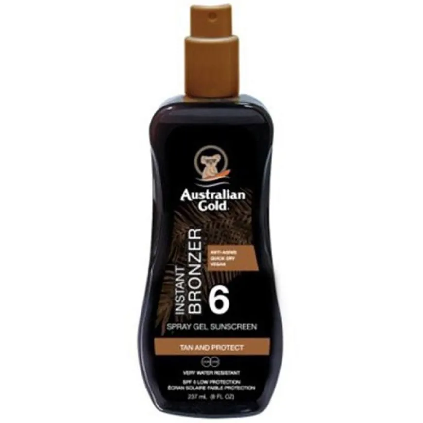 Instant Bronzer Spray Gel with Bronzer SPF 6 er en solspray. Med denne fantastiske solsprayen fra Australian Gold har du både beskyttelse og hjelp med brunfargen.Solsprayen beskytter mot både UVA og UVB stråler og inneholder naturlig bronzer som gir umiddelbar gylden glød.