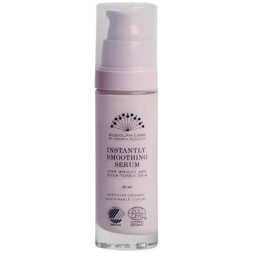 Instantly Smoothing Serum er et anti-aging serum som gir huden en umiddelbart jevnere og glattere struktur. Med kraftfulle ingredienser har serumet både en øyeblikkelig oppstrammende effekt og langtidsvirkende anti-age fordeler som reduserer ujevnheter og linjer. Serumet virker muskelavslappende, øker hudens elastisitet og gir en vakker glød og utstråling. Perfekt som base under makeup eller som del av din daglige hudpleierutine. Sertifisert med Svanemerket, Ecocert COSMOS Organic og Vegan Trademark.