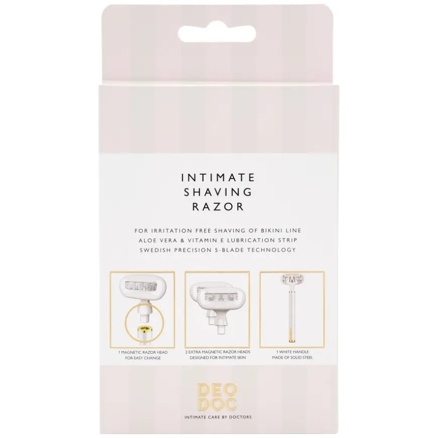 Intimate Shaving Razor White er en barberhøvel spesielt utviklet for en tett og silkemyk barbering i intimområdet. Den har 5 blader laget av svensk stål med avansert presisjonsteknologi, som sikrer en skånsom barbering uten irritasjon. Bladenes smørestripe er beriket med Aloe Vera og vitamin E, noe som gir en beroligende effekt på huden. Det magnetiske barberhodet gjør det enkelt å bytte blader, og det solide stålhåndtaket gir et komfortabelt og presist grep. Settet inkluderer en barberhøvel i stål (hvit) og 2 magnetiske barberbladshoder.