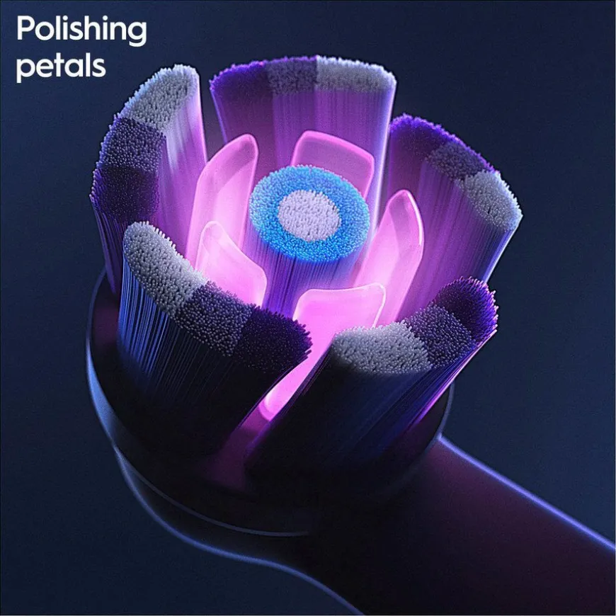 Oral-B iO Radiant White børstehode kombinerer en tannlegeinspirert rund børste med poleringselementer for skånsom fjerning av overfladiske misfarginger, for hvitere tenner fra første dag.