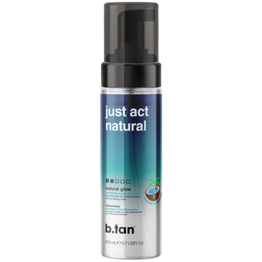 Just Act Natural Self Tan Mousse er en gjennomsiktig selvbruningsvann i mousseform. Den gir en naturlig mørk brunfarge på bare en time. Moussen er beriket med pleiende kokosvann og E-vitamin. Den er helt uten bronzer og smitter derfor ikke over på klær eller laken. Synlige resultater på en time, la virke i opptil åtte timer for et mørkere resultat. Moussen er 100% vegansk.