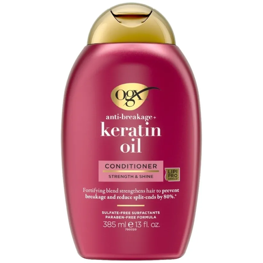 Ogx Keratin Oil hårpleieserie er utviklet for å beskytte håret mot slitte hårtupper, løse ustyrlige hårstrå, og gi håret elastisitet og styrke. Ogx Keratin Oil Balsam dufter av tropisk appelsin, ananas, og søt golden amber, som bidrar til å gi deg en eksklusiv spaopplevelse på badet.Serien er spesielt egnet for flisete og skadet hår og inneholder arganolje og proteiner fra keratin som hindrer skader fra varme, børste og styling. Håret blir glatt, mykt og blankt.