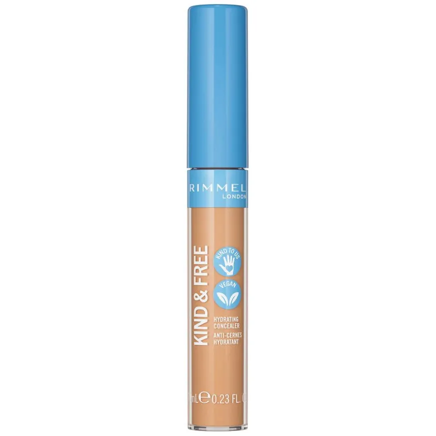 Kind & Free Hydrating Concealer fra Rimmel designet for bruk hele dagen, tilsatt et antioksidant vitaminkompleks (E & B5) for en frisk, glødende finish. Den byggbare flytende formelen vil ikke sprekke eller krølle, og etterlate deg med en feilfri, naturlig ansiktssminke. All emballasje laget av resirkulerte materialer som enkelt kan resirkuleres og er snillere mot miljøet. Concealeren under øynene er parfymefri, vegansk og grusomhetsfri. Tilgjengelig i 6 nyanser.