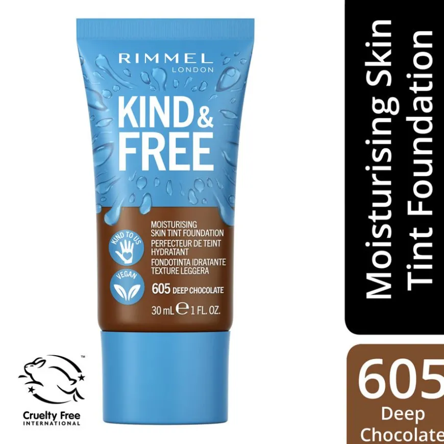 Kind & Free Moisturising Skin Tint fra Rimmel gir deg en bedre type skjønnhet – en fuktighetsgivende foundation som nærer huden din samtidig som den gir en jevn hudtone og visker bort uønskede ujevnheter. Foundationen er laget med 100% veganske og dyrevennlige ingredienser, ting som rett og slett er bra for deg og bra for planeten, inkludert et antioksidant-vitaminkompleks (E og B5) og aloe vera for en frisk glød og naturlig finish. Foundationens rene formel gir huden den fuktigheten den trenger. Laget med 77% ingredienser av naturlig opprinnelse. Ikke-komedogen, dermatologisk testet, egnet for sensitiv hud.