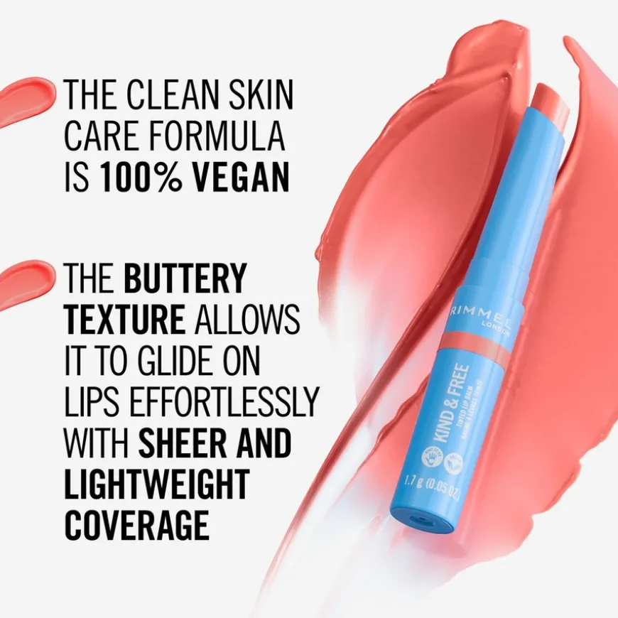 Rimmel Kind & Free Lip Tinted Lip Balm er en fuktighetsgivende tonet leppebalm som glir på uten anstrengelse med en smøraktig tekstur. Denne cruelty-free, veganske leppebalmen pleier leppene med en frisk farge og lett dekkevne. Den rene hudpleieformelen er 100% vegansk, med FSC-sertifisert emballasje laget med en miljøvennlig minimum på 30% post-forbruker resirkulert (PCR) innhold. Tilgjengelig i 6 fantastiske og inspirerte nyanser. Lev «London look»!