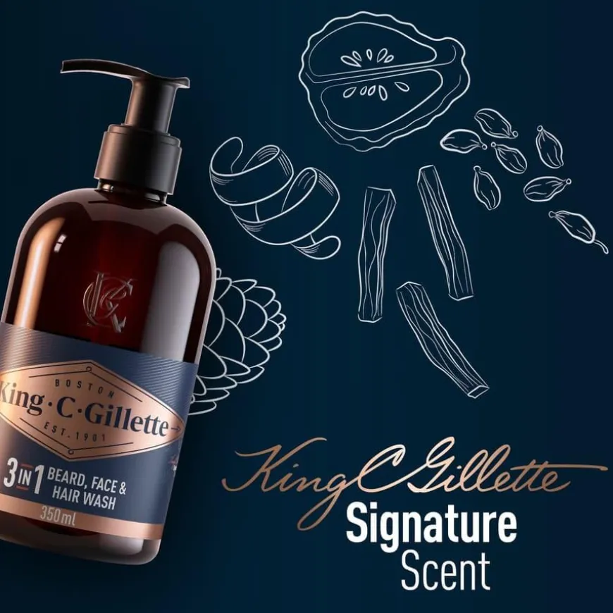 King C. Gillette 3-In-1 Beard Wash er en kremet og dyprensende skjeggsåpe som kombinerer effektiv rengjøring og pleie for både skjegg og hud. Den hjelper til å forebygge kløe som ofte oppstår ved tørr hud, og gir skjegget en myk, glatt og frisk følelse. Med en patentert balsamteknologi er den utviklet for å bevare både fukt og komfort – uansett om du har kort eller langt skjegg. Den maskuline signaturduften består av forfriskende noter som sandeltre, sedertre, bergamott, kardemommefrø og mandarin, og gir en behagelig og oppløftende opplevelse ved hver vask. Produktet er drøyt i bruk og varer i opptil 5 måneder ved daglig bruk i anbefalt mengde. King C. Gillette Beard Wash er et uunnværlig produkt i den daglige skjeggpleien, og et viktig steg for alle menn som ønsker å bære skjegg med stil og komfort.