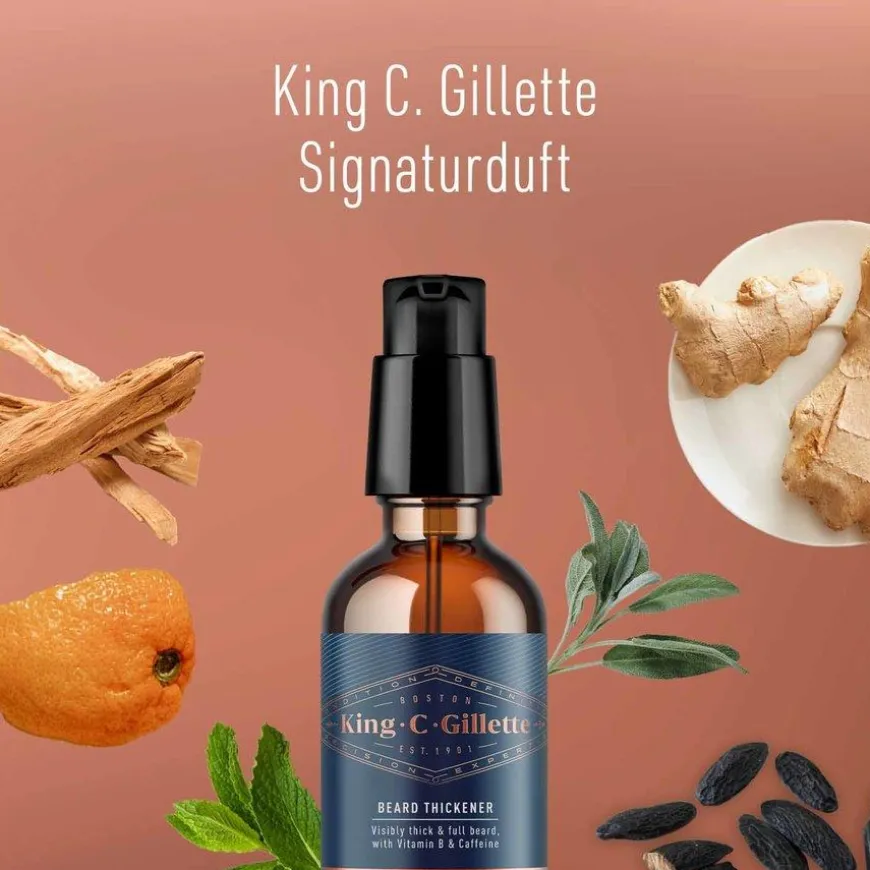 Beard Thickener Serum er et skjeggserum som får menns skjegg til å se og føles merkbart tykkere ut. Skjeggserumet er beriket med vitamin B3 (nikotinamid), provitamin B5 (pantenol), arganolje og koffein. Det styrker og gjør hvert hårstrå tykkere, for å beskytte mot brukne hårstrå og få skjegget til å se fyldig ut. King C. Gillette skjeggserum pleier også håret for å gi myke og glatte kanter – for økt komfort. Formelen, med King C Gillettes signaturduft, er både lett og hurtigtørkende og beroliger og kjøler huden.