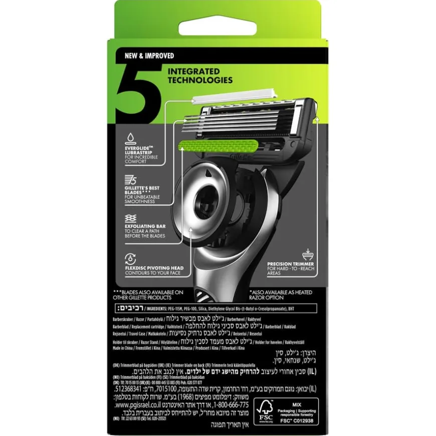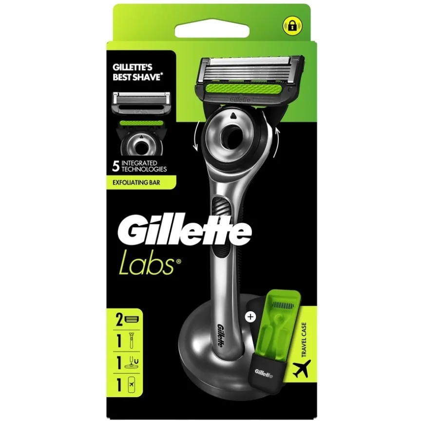 GilletteLabs With Exfoliating Bar Razor er verdens første barberhøvel med innebygd eksfoliering i håndtaket, som løsner døde hudceller og inngrodde hår før barbering. Resultatet er en tettere, glattere og mer behagelig barbering – i ett eneste strøk. Høvelen er utstyrt med 5 av Gillettes beste blader og EVERGLIDE™ Lubrastrip, som smører huden for maksimal komfort. Med 2D FlexDisc-teknologi følger barberhodet ansiktets konturer for optimal kontakt og kontroll. Settet inkluderer barberhøvel, 2 barberblader, magnetstativ og et elegant reiseetui – perfekt for både hjemmebruk og på farten. Brukes med GilletteLabs barberblader.
