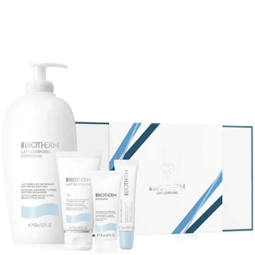 Biotherm Lait Corporel Set et et hudpleiesett bestående av Biotherm Lait Corporel 400ml, Lait de douche 50ml, Beurre De Levres Lip Balm 13ml & Biomains Handcream 20ml. Til alle hudtyper.