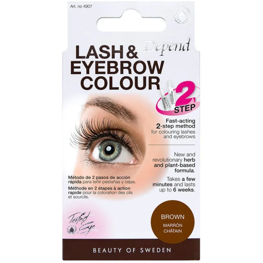 Depend Lash And Eyebrow Colour er en hurtigvirkende to-trinnsmetode for fargin av vipper og bryn. Urte- og plantebasert formel gjør at fargen holder i opptil 6 uker og tar kun noen minutter å påføre.