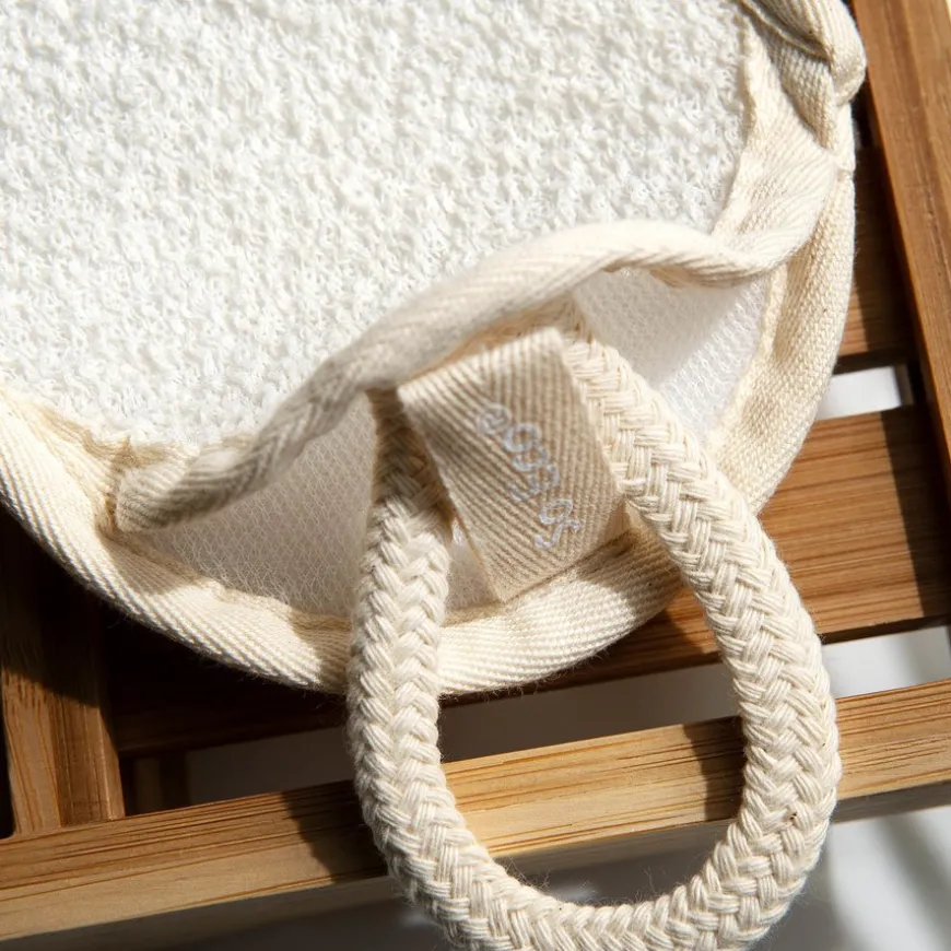 Laget med en blanding av resirkulert polyester og økologisk bomull. Resulterer i en grov teksturert pose for naturlig eksfoliering og dyp rensing, og etterlater huden smidig.