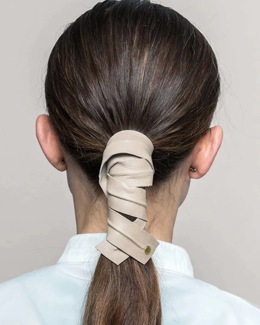 Leather Band Long Bendable er et kreativt skinnbånd med lang bøyning. Bare fantasien din kan begrense de forskjellige måtene å bruke den på! Vri den rundt hestehalen, «tutten» eller bruk den som hårbånd.