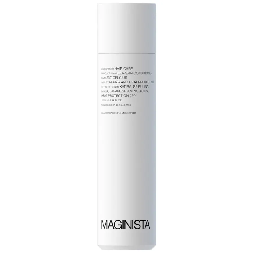 Maginista sin 230° Celsius Leave-in Conditioner gir ultrahøy beskyttelse. Denne formelen er basert på planteekstrakter som katira fra Midtøsten, maca fra Peru og spirulina fra Hawaii. Samtidig tilfører hydrolysert erteprotein ekstra fuktighet. Som resultat beskyttes håret ditt opptil 230 °C og etterlates glattere og mer livlig.