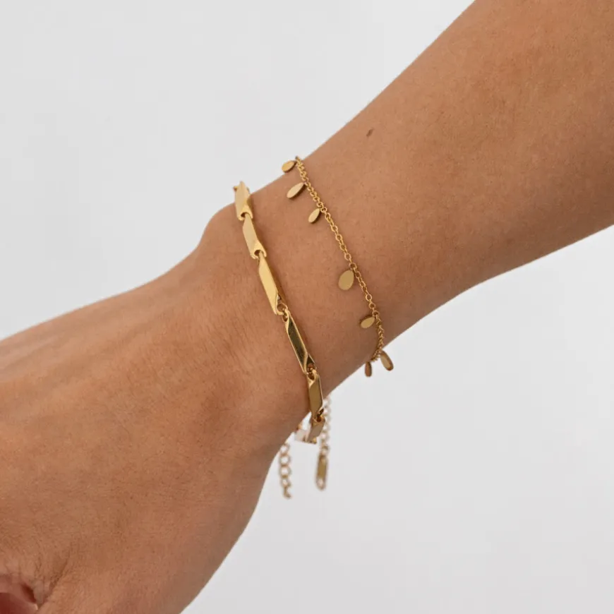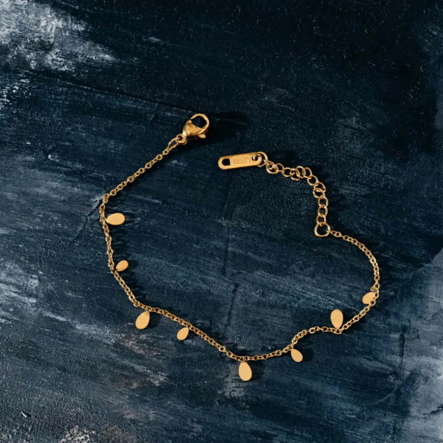 Lia Tiny Oval Bracelet er et elegant og holdbart armbånd laget i rustfritt stål med 18k gullbelegg. Med en tynn kjede pyntet med små, ovale skiver gir armbåndet et fyldigere og sofistikert uttrykk. Designet for daglig bruk, tåler det både vann og aktivitet uten å miste sin glans. Et nydelig tilbehør som enkelt kan brukes alene eller kombineres med andre smykker.