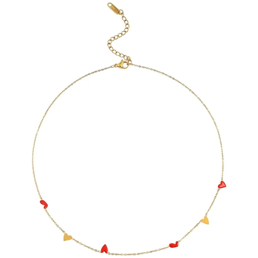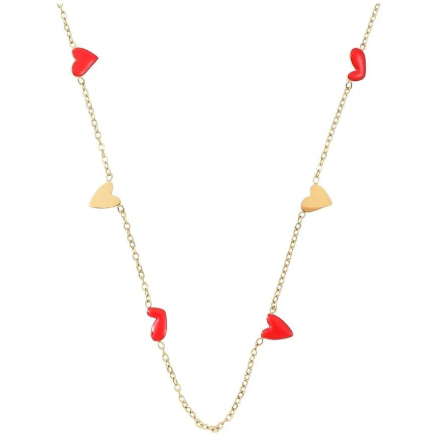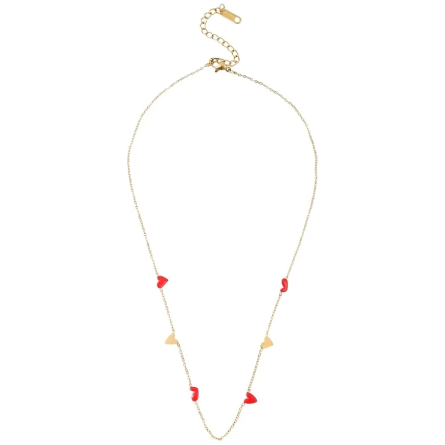 Linnea Heart Chain Necklace Red and Gold er et lekent og sofistikert smykke som tilfører en touch av farge og romantikk til stilen din. Det dristige røde emaljehjertet kombineres med slitesterkt rustfritt stål med 18k gullbelegg, noe som gir et luksuriøst og moderne uttrykk. Halskjedet er ripebestandig og designet for å beholde sin glans over tid. Bruk det alene for et elegant statement eller kombiner det med andre smykker for en personlig look. Laget av Happy People og fri for nikkel, kadmium og bly.