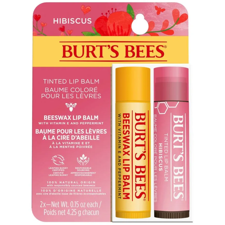 Lip Duo Tinted Lip Balm Hibiscus + Lip Balm Beeswax Blister er et pleiende sett bestående av leppeprodukter. Hydrer tørre lepper og tilfør også en farge med Burt’s Bees leppepomade duopakke, som inneholder en Bivoks Leppepomade og en Farget Leppepomade i Hibiscus-farge.