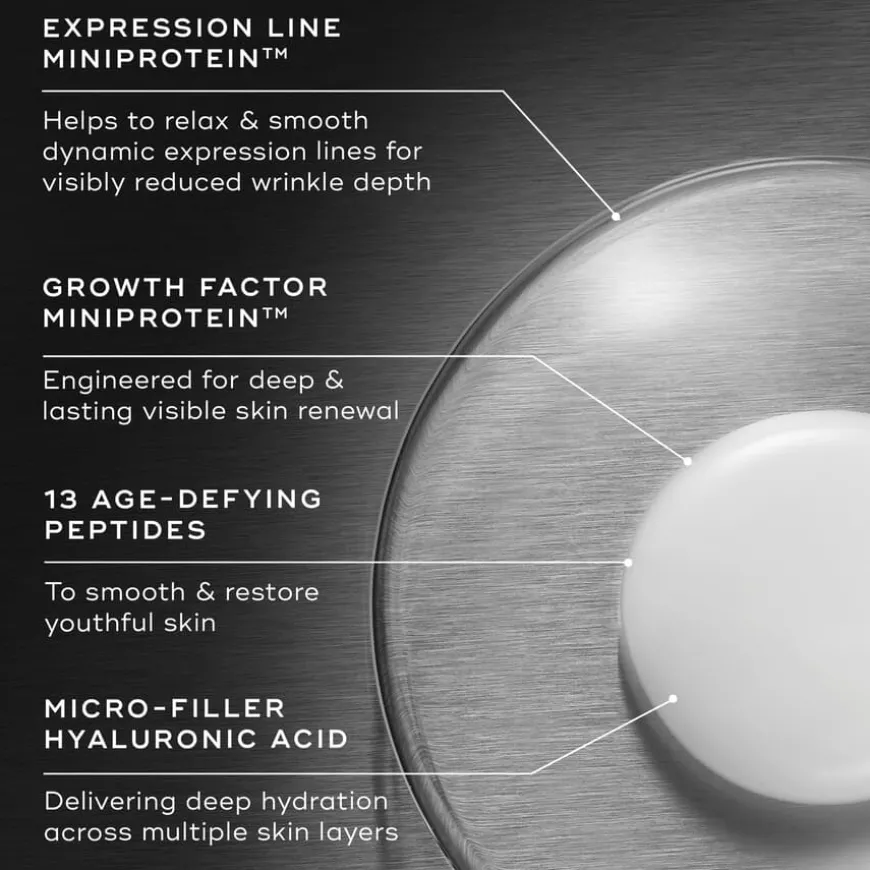 Aqua (Water), Glycerin, Dimethicone, Dimethyl Isosorbide, Butylene Glycol, Undecane, Arginine, Inulin, Microcrystalline Cellulose, Ceteareth-20, Tridecane, Tocopherol, Hydroxyacetophenone, Sodium Hyaluronate, Palmitoyl Tripeptide-38, Panthenol, Caprylic/Capric Triglyceride, Palmitoyl Tripeptide-5, Polyacrylate Crosspolymer-6, Palmitoyl Tripeptide-1, Pullulan, Tetrapeptide-21, Palmitoyl Tetrapeptide-10, Palmitoyl Tetrapeptide-7, Ammonium Polyacryloyldimethyl Taurate, Glyceryl Linoleate, Acetyl Hexapeptide-8, Pentapeptide-18, Oligopeptide-1, Arginine/Lysine Polypeptide, Sucrose Palmitate, Cetyl Palmitate, Phenoxyethanol, Ethylhexylglycerin, Carbomer, Copper Palmitoyl Heptapeptide-14, Heptapeptide-15 Palmitate, Benzotriazolyl Dodecyl P-Cresol, Polysorbate 80, Sorbitan Stearate, Polysorbate 20, Carnosine, Sodium Metabisulfite, Dunaliella Salina Extract, Helianthus Annuus (Sunflower) Seed Oil, Hydroxypropyl Cyclodextrin, Dimethicone/Vinyl Dimethicone Crosspolymer, Sodium Benzoate, Hydrogenated Lecithin, Caprylyl Glycol, Pantolactone, Xanthan Gum, Disodium EDTA, T-Butyl Alcohol, Potassium Sorbate, Citric Acid, Glyceryl Caprylate, Lactic Acid/Glycolic Acid Copolymer, Polyvinyl Alcohol, Phenylpropanol.