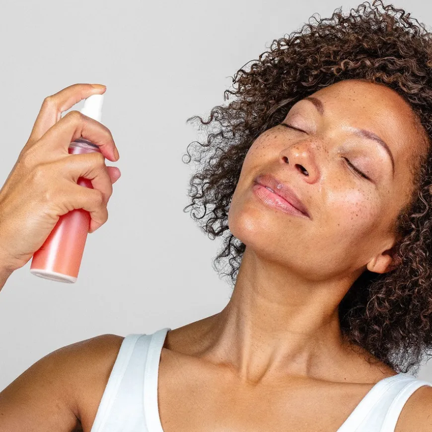- Hold flasken 20-30 cm fra ansiktet og spray 2-3 pump jevnt over hele ansiktet.
