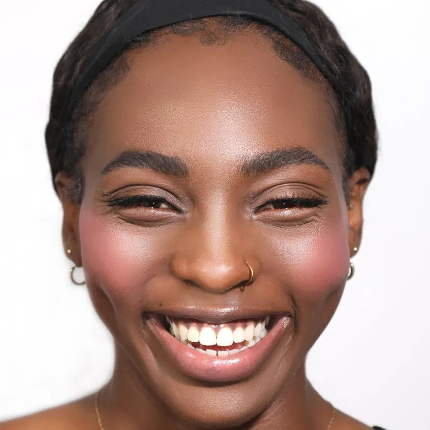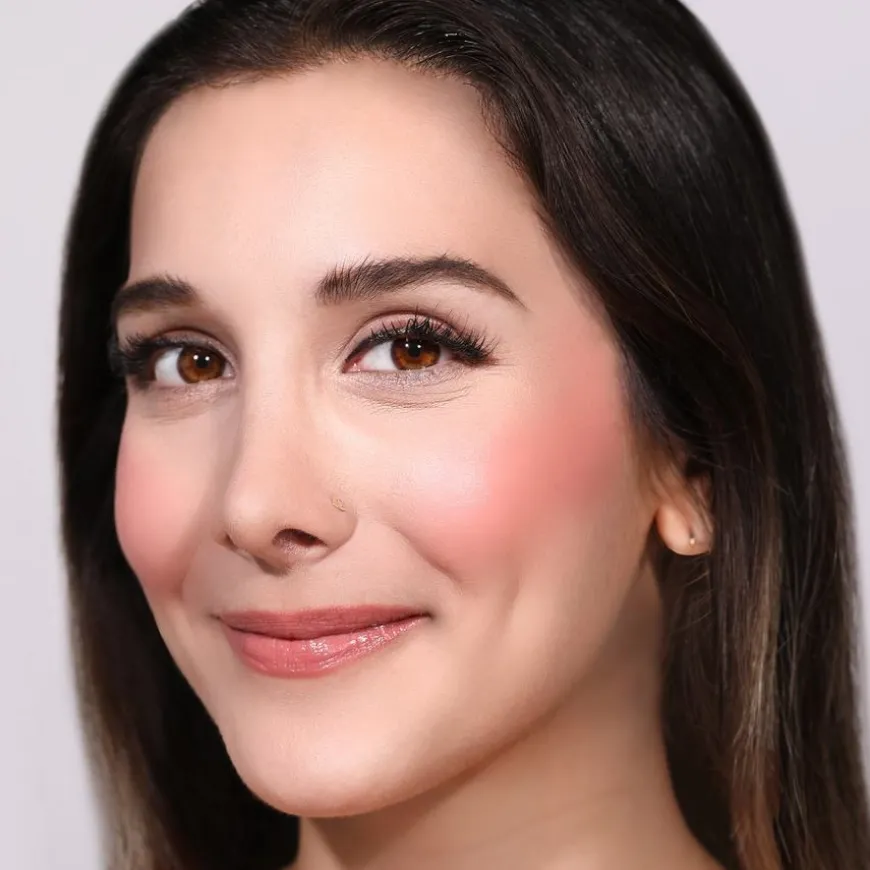 - For å påføre blushen, fjern forsiktig overflødig produkt fra applikatoren og prikk det på eplene av kinnene, start med en liten mengde.