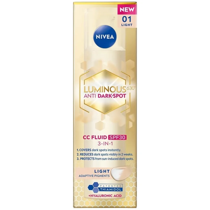 Luminous630 Anti Dark-Spot CC Fluid 3In1 Light er en farget dagkrem som gir jevn og strålende hud med en trippelvirkende formel. Mikroinnkapslede pigmenter tilpasser seg hudtonen for en naturlig dekning som jevner ut mørke flekker. Den avanserte THIAMIDOL®-formelen reduserer synlige mørke flekker på 2 uker og jevner ut hudtonen med +40 % på 8 uker (basert på en 12-ukers egenvurdert studie med 51 kvinner, 2023). Samtidig beskytter SPF 30 huden mot solen og forhindrer at mørke flekker dukker opp igjen. Den lette formelen passer for alle hudtyper, inkludert sensitiv hud, og gir en naturlig, strålende finish. For best resultat, bruk den sammen med NIVEA Luminous630 Anti Dark-Spot Serum.
