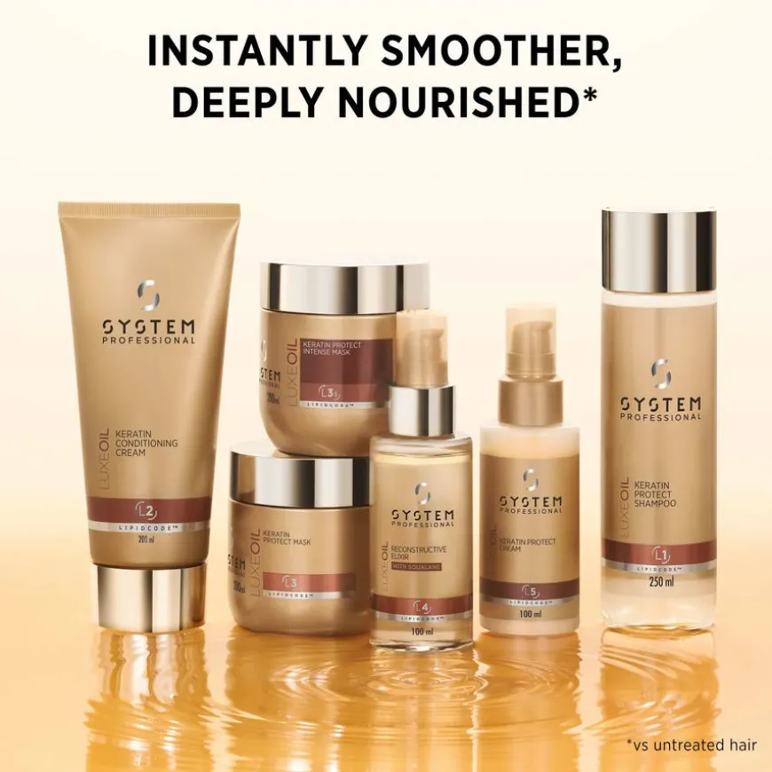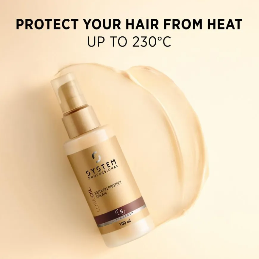LuxeOil Keratin Protect Cream er en luksuriøs leave-in behandling designet for å beskytte og styrke håret. Den bruker en blanding av lette oljer, inkludert arganolje, jojobaolje og mandelolje, for å beskytte hårets keratin og gi langvarig glatthet og forbedret glans uten å tynge håret. Kremen er ideell for å forebygge skader fra varmestyling samtidig som den nærer håret, etterlater det mykt, håndterbart og fritt for frizz.