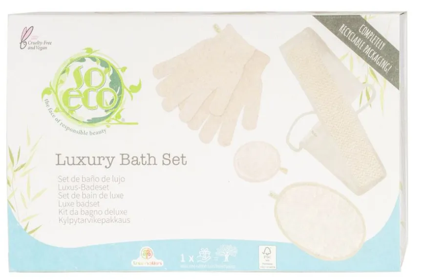 So Eco Luxury Bath Set er et luksuriøst og miljøvennlig badetilbehørssett. Skap en nydelig spaopplevelse og slapp av hjemme med dette settet som består av fire badetilbehørsprodukter. Buff bort døde hudceller og avslør en frisk og strålende hudtone samtidig som du er snill mot planeten.