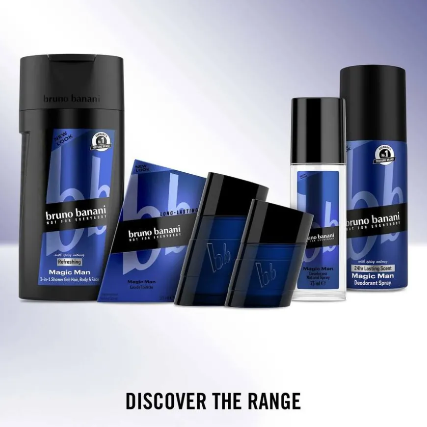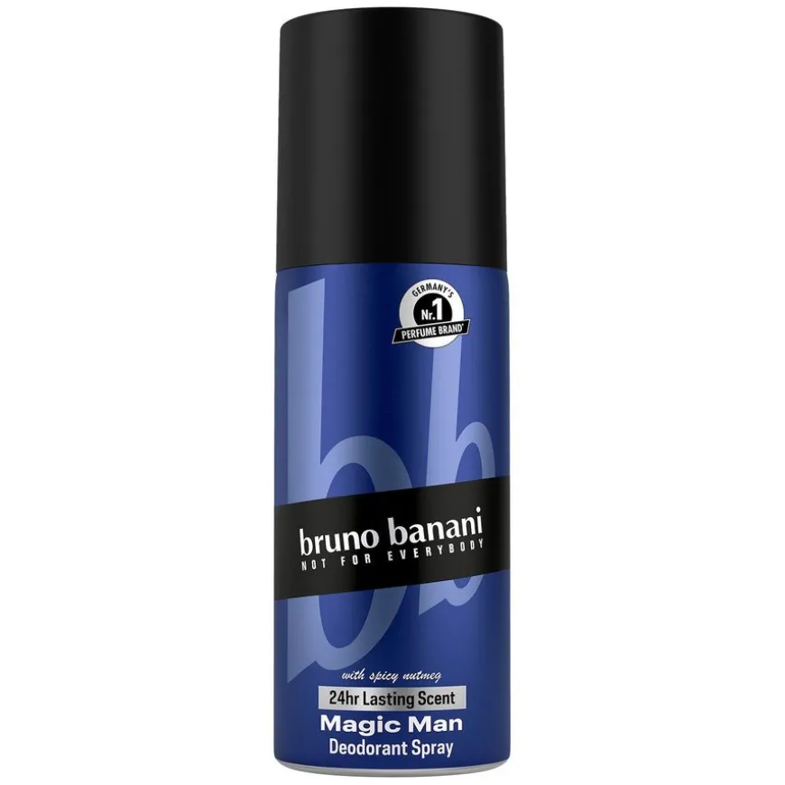 Bruno Banani Magic Man Deodorant er en kroppspray som har en maskulin duft som utøver sin kraft til å fortrylle og tiltrekke. En stimulerende akkord av gin akkompagnert av mytisk røkelse fra Somalia og Guatemala kardemommeblanding med de forførende akkordene av kakaotre, pecan og syklamen. Patchouli fra Indonesia og krydret trearoma gir en karismatisk kant. Bruno Banani Magic Man-duften er rettet mot sjarmerende, selvsikre menn som ikke tar seg selv så høytidelig.
