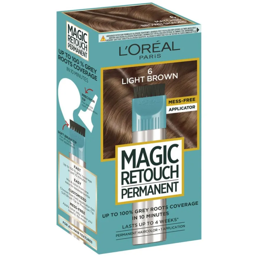 Magic Retouch Permanent etterveksthårfarge tilbyr deg en quick fix mellom frisørbesøk eller hjemmefarge. Den smelter sammen med hårfargen din og gir deg et flott, jevnt resultat med opptil 100 % gråhårsdekning på bare 10 minutter. Med det nøyaktige påføringsmunnstykket kan du enkelt, raskt og uten søl skjule etterveksten. Permanent hårfarge som holder opptil 4 uker*. Passer til alle hårtyper *Instrumentelle tester. Enkelt – bland & farg direkte med den myke, klembare applikatorflasken. Spesialtilpasset – velg mellom to ulike munnstykker for å påføre. Uten søl – påfør fargen der du har behov for den. Uten søl!