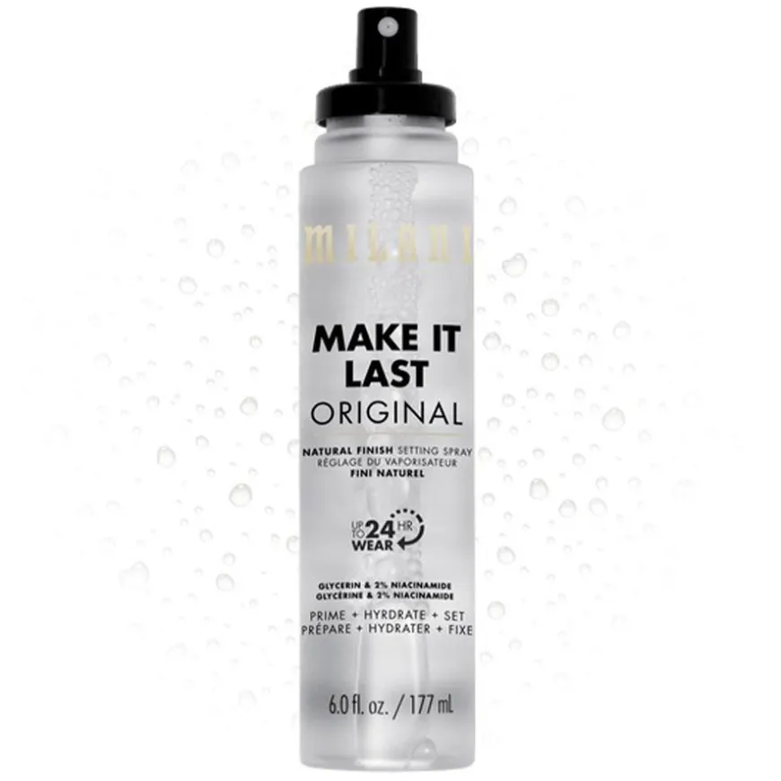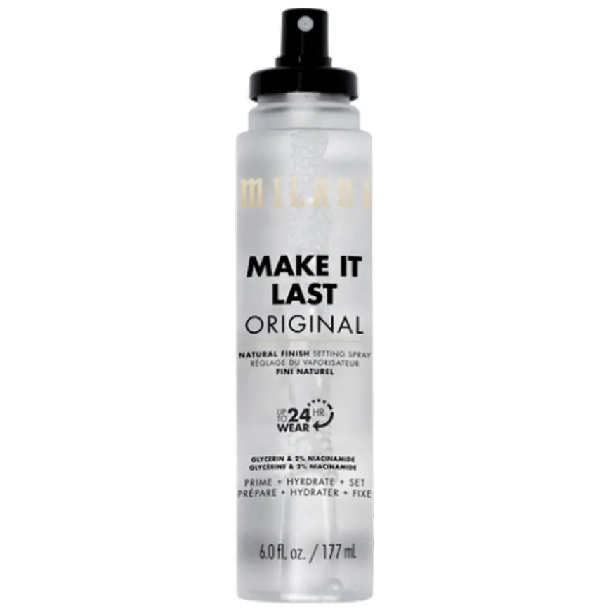 Make It Last Original Natural Finish Setting Spray er en sminke-låsende magi, nå i en jumbo-størrelse. Med opptil 24 timers hold, leverer Amerikas #1 setting spray vanntette og svettebestandige resultater du kan stole på for å låse inn utseendet ditt i lang tid.* Laget med fuktighetsrik glyserin og multitaskende hudkraftverk 2 % niacinamid, forbereder, hydratiserer og setter denne lette sprayen sminke og etterlater huden med en perfekt naturlig finish. Den veganske og dyrevennlige formelen hjelper også med å holde sminken fra å falme og sette seg i linjer, slik at utseendet ditt varer hele dagen og natten.