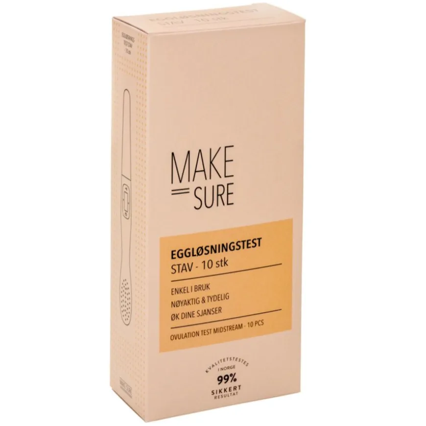 Make Sure Ovulation Test Stick er en miljøvennlig og svanemerket hjemmetest for å finne nøyaktig tidspunkt for eggløsning, noe som gjør det enklere å planlegge graviditet. Testen er 99 % nøyaktig og gir raskt svar på når sjansen er størst for å bli gravid. En pakke med 10 stavtester holder normalt til én syklus, som er tiden mellom to menstruasjoner.