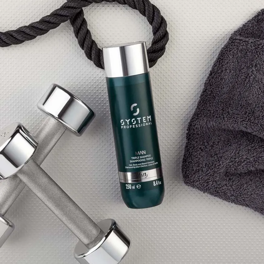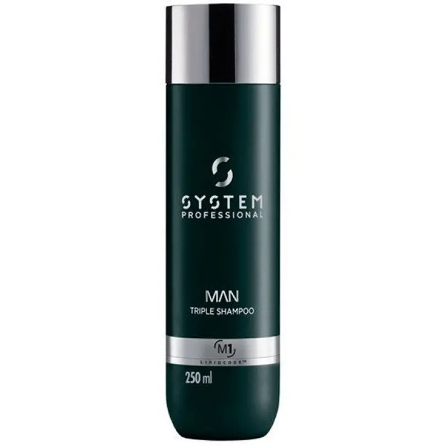 System Professional Man Triple Shampoo er en kreatinberiket og anvendelig rengjøring til håret, kroppen og skjegget.