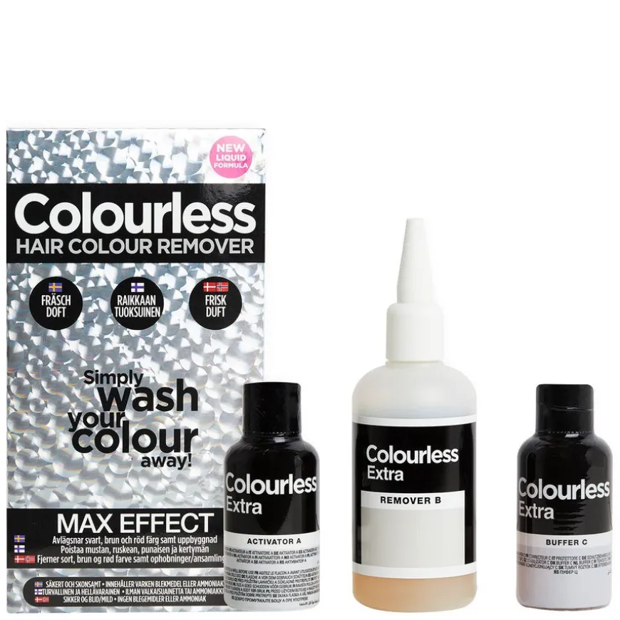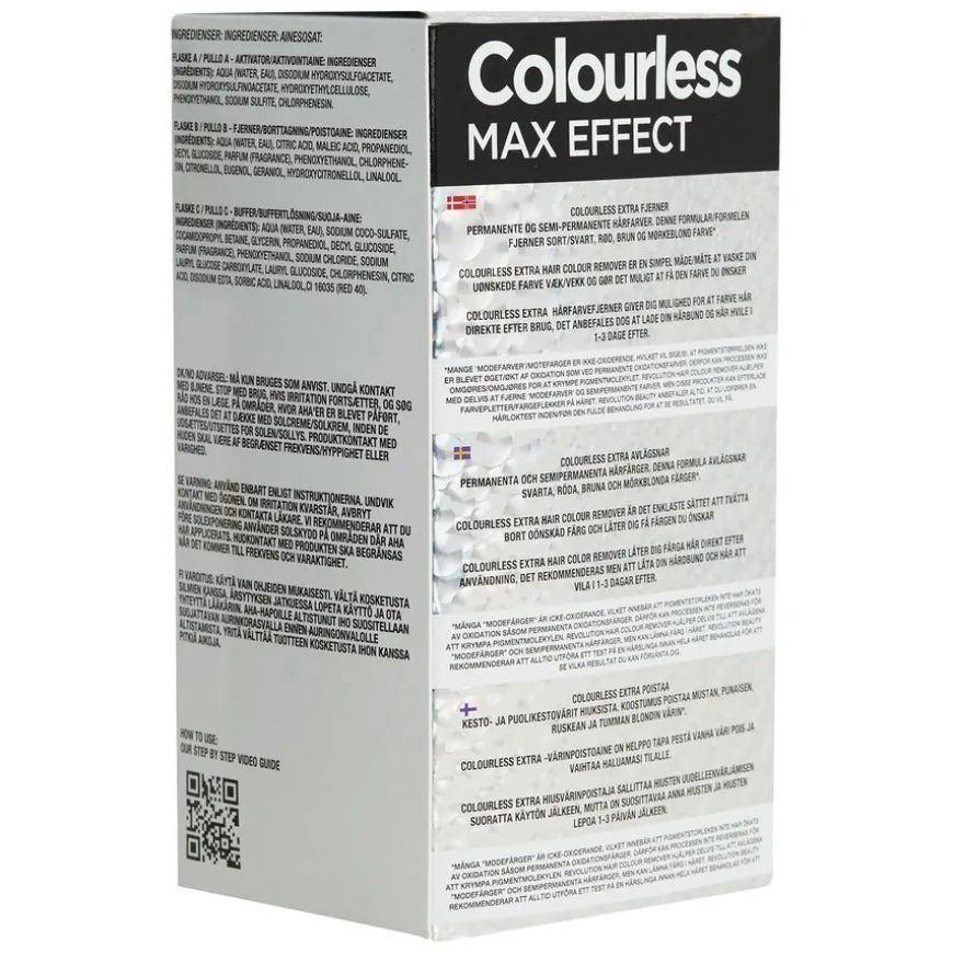 Colourless Max Effect Hårfargefjerner fjerner effektivt permanent og semi-permanent hårfarge, inkludert vanskelige nyanser som brunt, rødt og fargeoppbygging. Denne hårfargefjerneren er trygg og skånsom, uten blekemiddel eller ammoniakk og passer for de fleste hårtyper. Settet inneholder en aktivator, fargefjerner, buffer, hansker og en full instruksjonsbrosjyre. Produktet er imidlertid ikke egnet for henna-behandlet eller afro-teksturert hår. Det anbefales heller ikke for barn under 16 år. For best resultat anbefales det å utføre en test på et lite område før full påføring. Du kan farge håret på nytt umiddelbart etter bruk, men det anbefales å la hodebunnen og håret hvile i 1-3 dager.