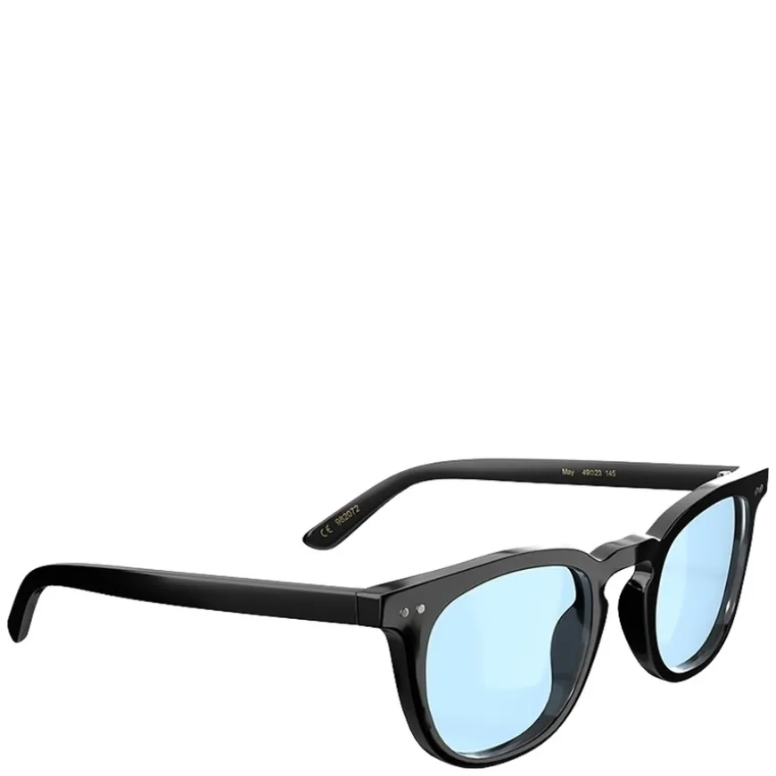 May Black Blue har et wayfarer-inspirert design laget av premium acetat. Den sorte rammen passer perfekt sammen med blå linser for en klassisk og stilful look.