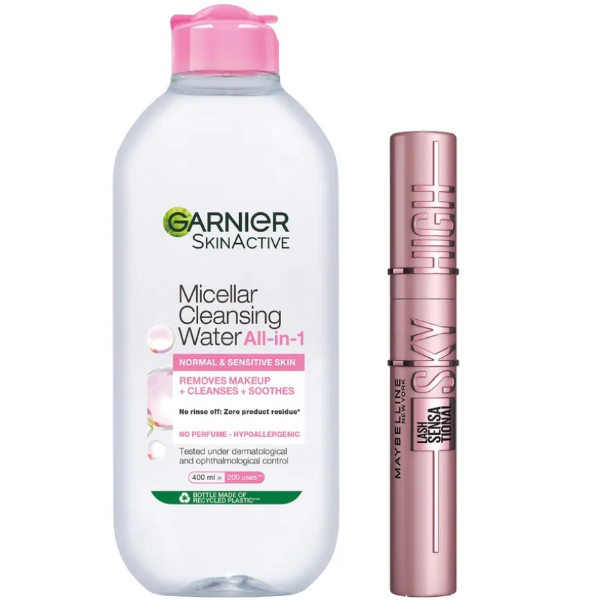 En duo bestående av en mascara for drømmelignende lengde og fylde og et rensende, pleiende micellært vann for ansiktet. Lash Sensational Sky High Mascara Black er en mascara for sensitive øyne, beriket med bambusekstrakt og -fibre som gir fyldigere vipper med drømmelignende lengde. Garnier Micellar Cleansing Water gjør det enkelt å fjerne sminkerester og smuss. Etterlater huden frisk og pleiet og trenger ikke å vaskes av med vann. Uten parfyme, testet under oftalmologisk og dermatologisk kontroll.