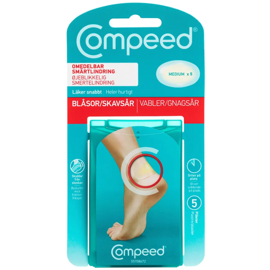Compeed Blis er mellomstore gnagsårplaster som absorberer overflødig fuktighet og danner en beskyttelsespute som gir umiddelbar smertelindring og optimale forhold for leging av gnagsår på føtter. Plastrene fungerer som et ekstra hudlag og gir trykkavlastning, smertelindring og beskytter dessuten mot vann, smuss og bakterier. Hydrokolloiden skaper et fuktig sårmiljø, og dette gir best mulige forutsetninger for leging av gnagsår eller vannblemmer. Når eventuell væske fra vannblemmen kommer i kontakt med hydrokolloidplasteret, skapes en gel som gir optimal støtdemping mot friksjon og trykk. Dessuten hindrer plasteret at det dannes sårskorpe, noe som fremskynder legingsprosessen. Plasteret kan brukes i flere dager og løsner av seg selv. Rask trykkavlastning og smertelindring. Optimal beskyttelse mot smuss og bakterier. Diskret og behagelig. Hypoallergent og vanntett. Sitter på plass i flere dager.