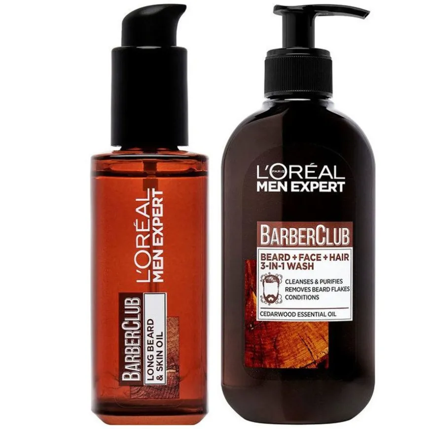 - L’Oréal Paris Men Expert Barber Club Beard + Face + Hair 3-In-1 Wash:Men Expert Barber Club Beard + Face + Hair 3-In-1 Wash er en 3-i-1-vask til til skjegg, ansikt og hår. Med naturlige eteriske oljer som renser skjegget for flass, smuss og lukt og etterlater det mykere. Renser også ansiktet skånsomt og effektivt og rengjør hodebunnen så den føles behagelig.