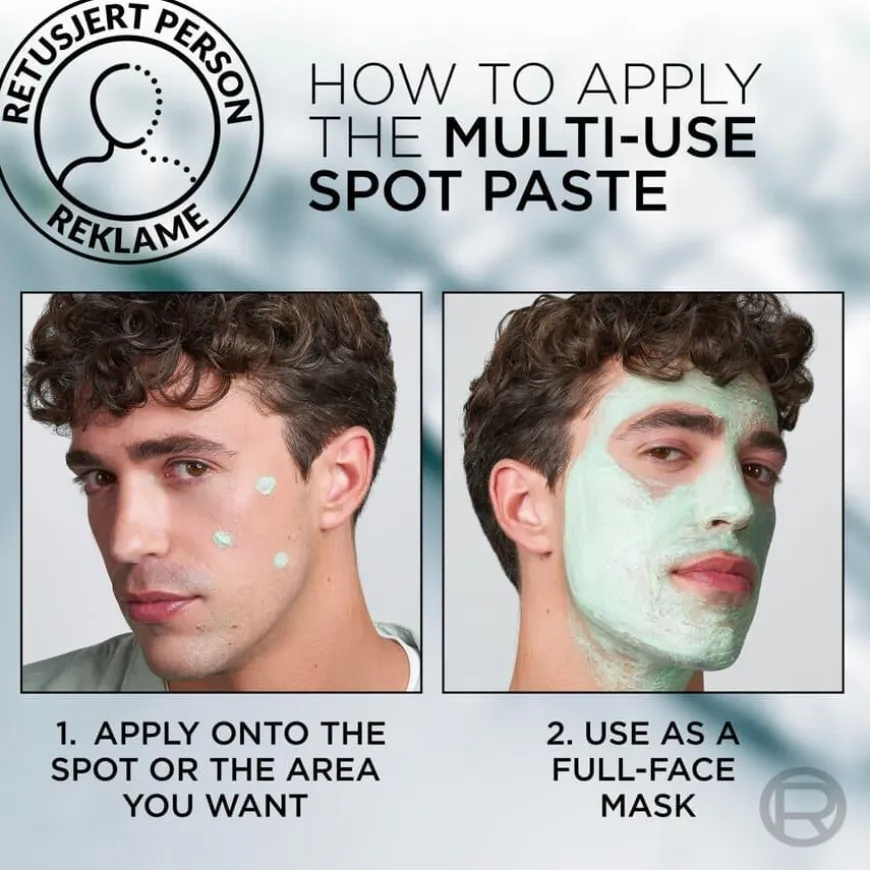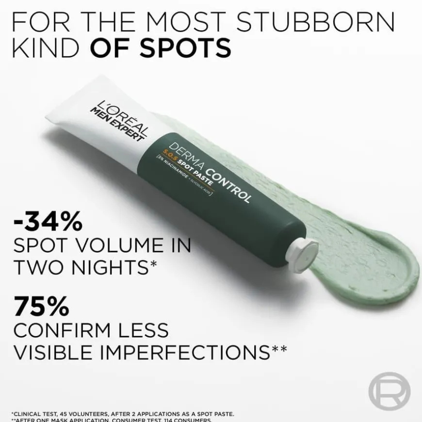L’Oréal Paris Men Expert Derma Control S.O.S Spot Paste er et produkt som kan brukes målrettet direkte på urenheten eller i hele ansiktet som en ansiktsmaske, 1 gang i uken, om kvelden, for å motvirke urenheter. Produktet bekjemper urenheter, eksfolierer, har en rensende virkning på uren hud. Formelen er beriket med glykolsyre (AHA) som eksfolierer døde hudceller for å hjelpe til å åpne porer og rense huden og 5 % niacinamid som synlig minimerer porene og beroliger huden. Passer også til sensitiv hud. Full rutinen med rensegelé og ansiktskrem i samme serie. Unngå øye- og leppeområdet. Skyll straks med rikelig med vann ved kontakt med øynene.